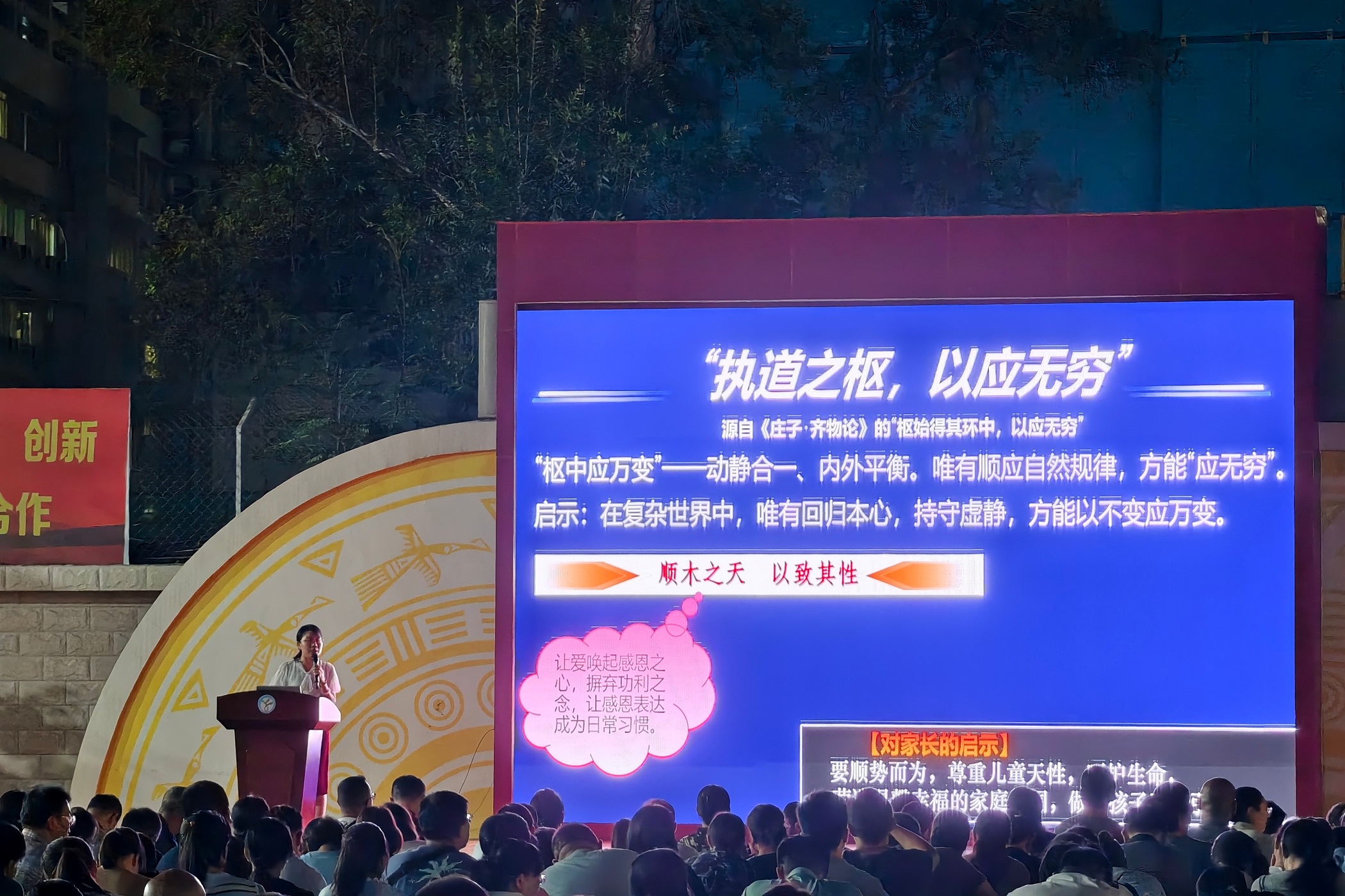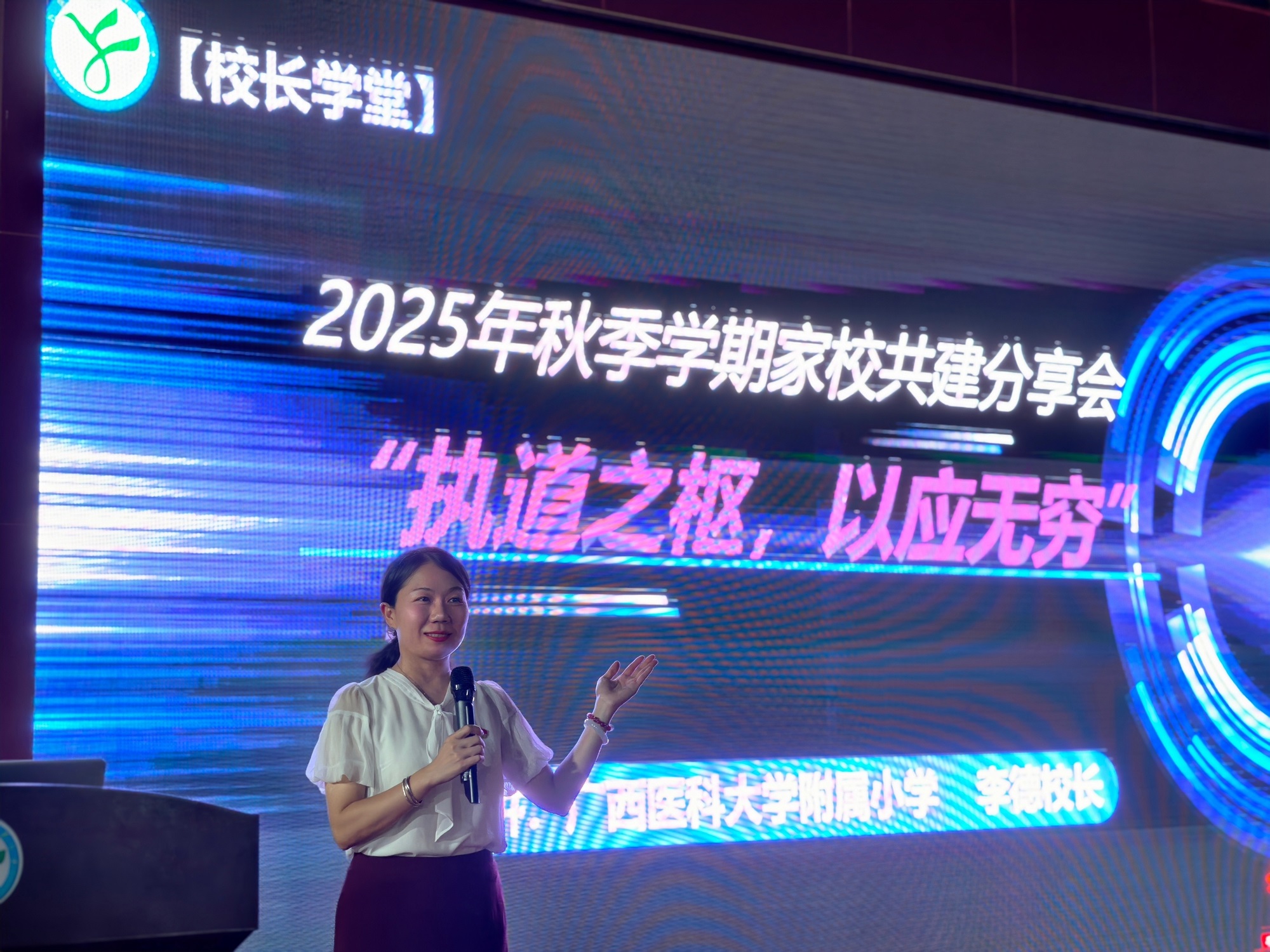 会议由黄琦副校长主持。会议首个环节为“校长学堂”。附小李德校长以“执道之枢 以应无穷”为主题,与家长们进行了深度交流。她以详实的数据、生动的案例,系统汇报了学校近五年来在办学质量、师资建设、特色课程、学生发展等方面取得的显著成效,让家长们清晰看到孩子在学校的成长环境与发展平台。