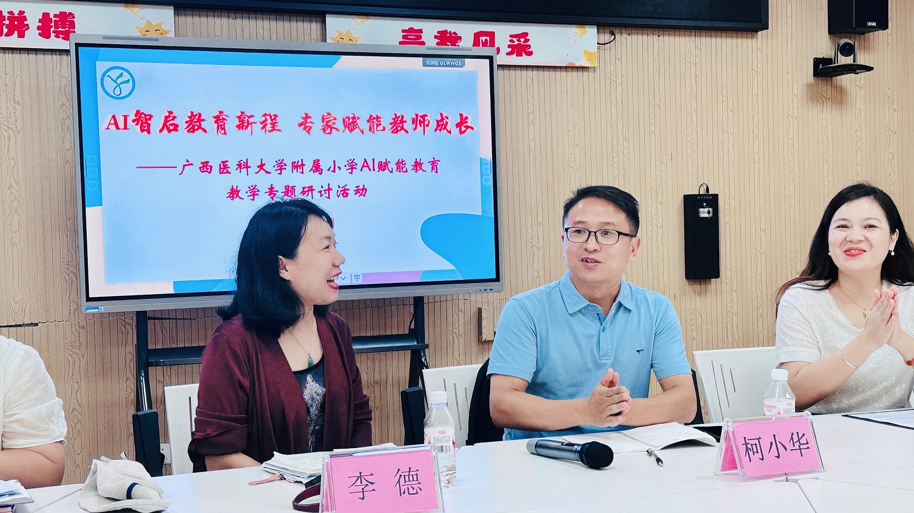 作为教育信息化领域的资深专家,柯小华部长长期深耕教育技术规划与信息化推进工作,不仅深度参与广西教育信息化发展蓝图的制定,更始终扎根中小学教学实践一线,致力于帮助教师解决“AI用不好、用不活”的实际难题。交流会伊始,主持人隆重介绍了柯部长,全场响起热烈掌声,彰显了与会教师对本次研讨的热切期待。会上,主持人详细分享了我校作为自治区校本研修示范校在AI赋能教育领域的探索成果。