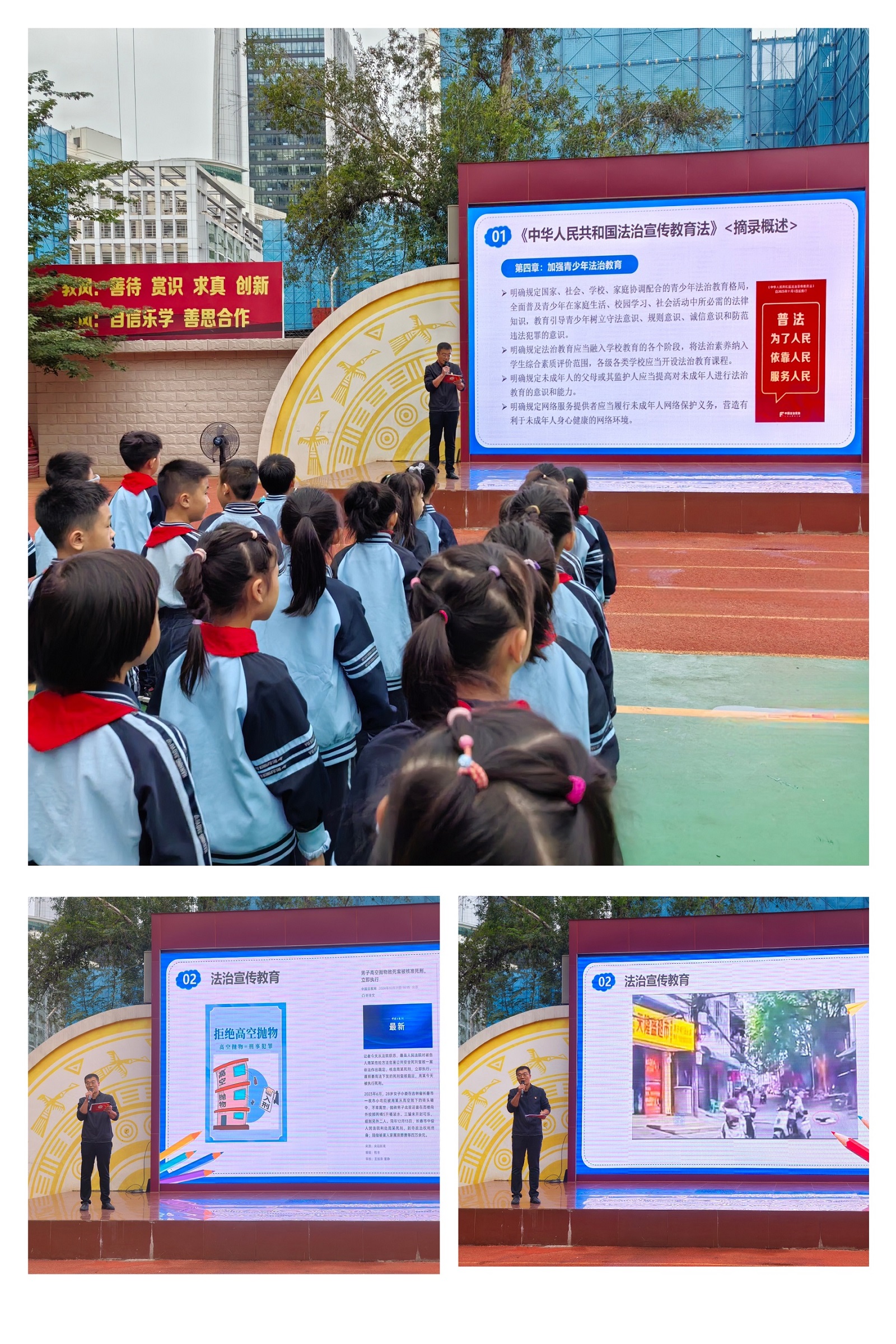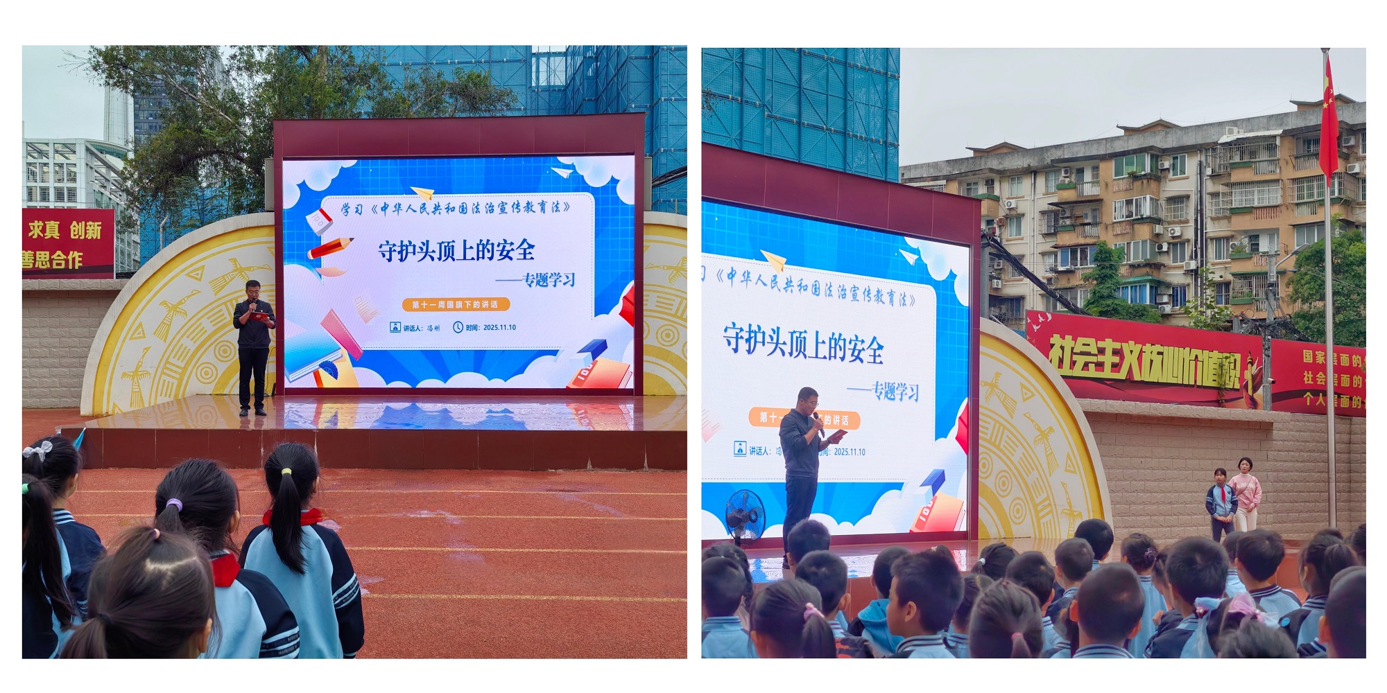为深入贯彻《中华人民共和国法治宣传教育法》,强化师生法治意识与安全防护能力,11月10日周一晨会,我校附属小学以国旗下讲话为载体,开展“学习法治宣传教育法暨守护头顶上的安全”专题学习活动,由附小德育处冯刚主任为全校师生上了一堂生动的法治安全必修课。