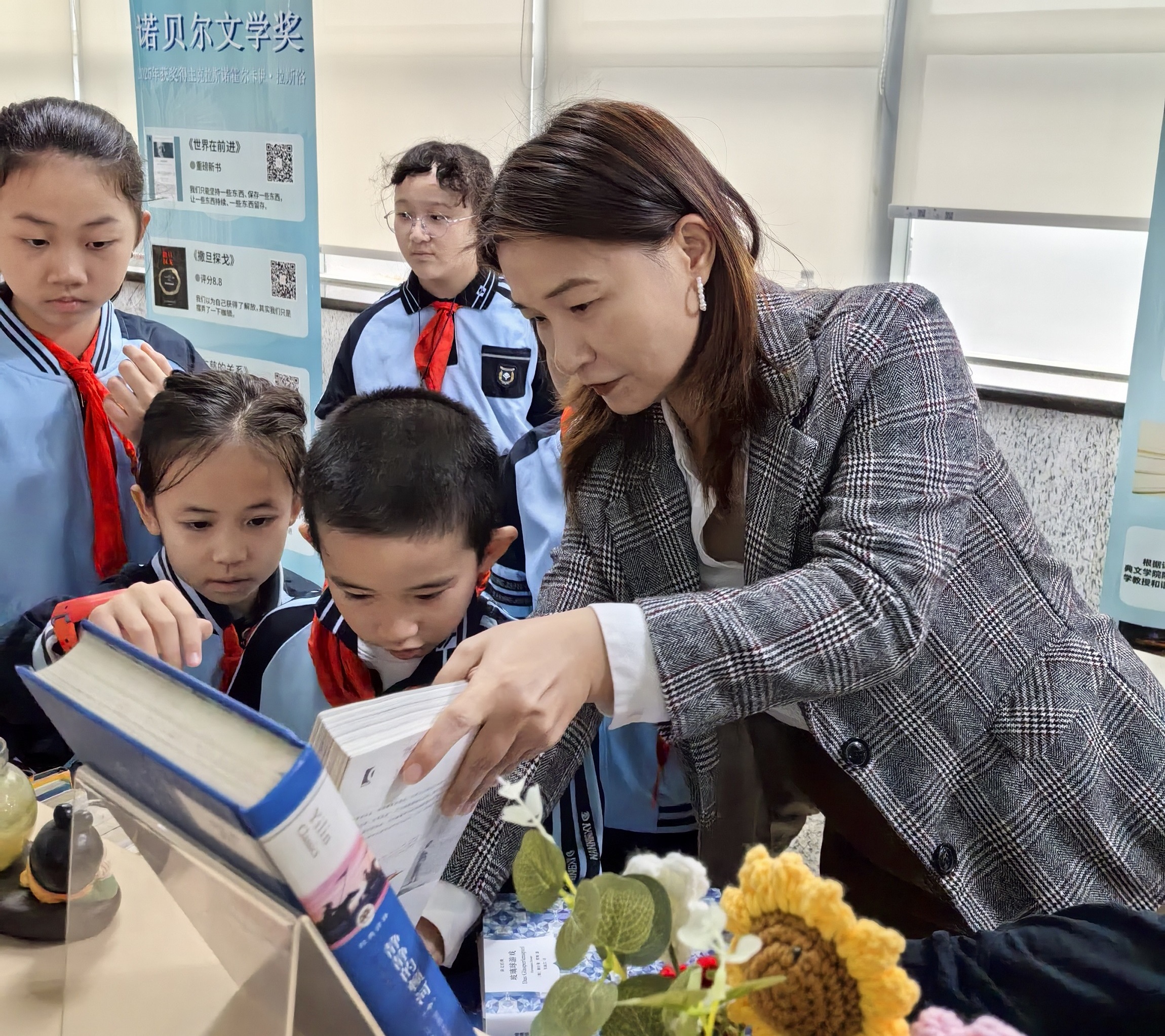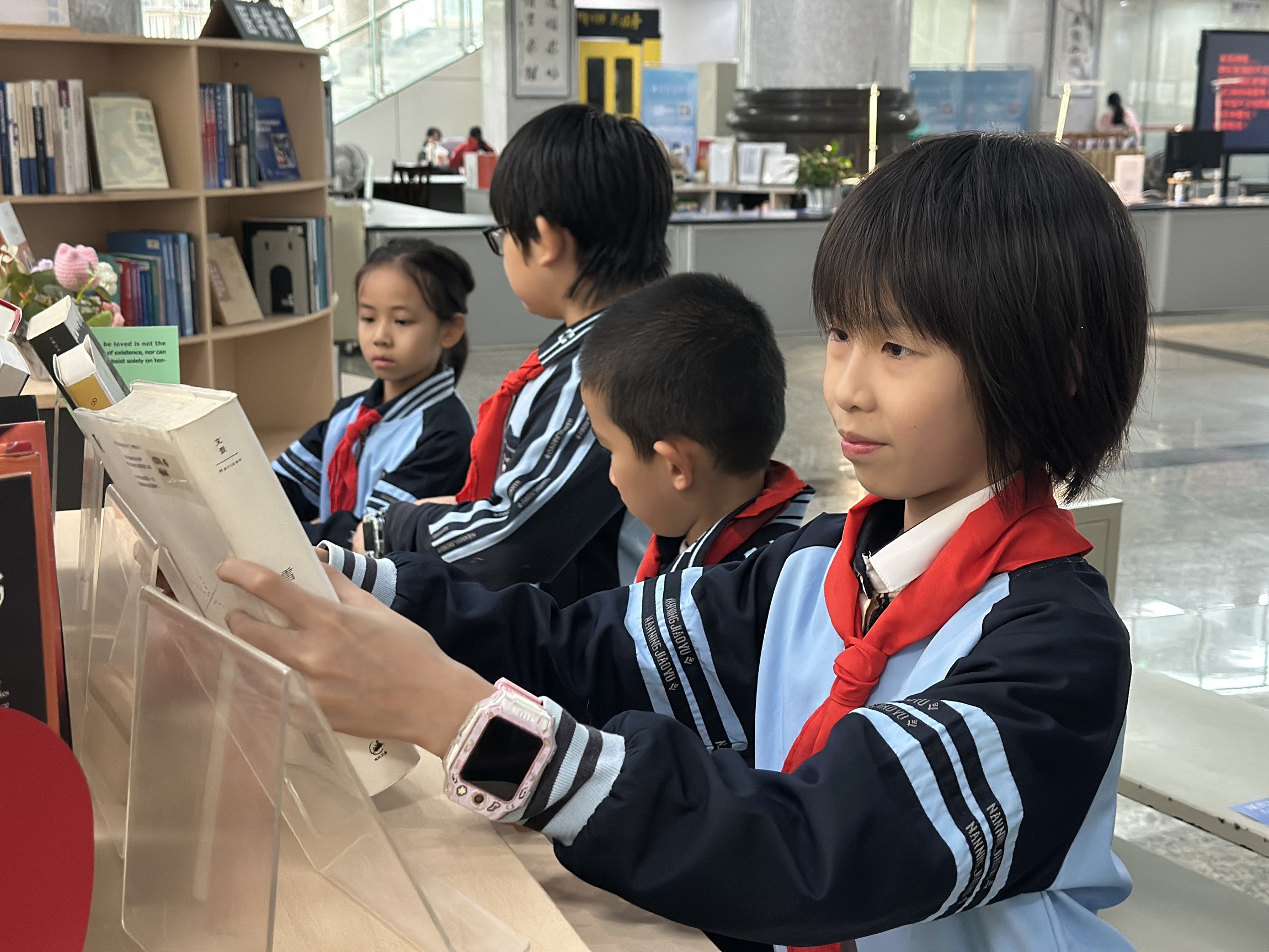 在“小小图书管理员”布展实践环节,同学们迅速分成小组,分工协作:有的到三楼挑选书籍,把它们运到一楼展厅;有的轻拿轻放,将书籍按主题分类摆放,确保展台整齐有序;有的细心擦拭书架,不放过任何一处灰尘;还有的围在展柜前,交流自己读过的经典片段,分享对书中人物精神的理解……图书馆内,孩子们忙碌的身影与整齐陈列的书籍相映成趣,成为当天最温馨的画面。“亲手把这些经典书籍摆进展柜,感觉自己也成了文学的‘小使者’,以后我要读更多好书,学习书中人物的优秀品质!”四年级学生刘玥玥笑着说。