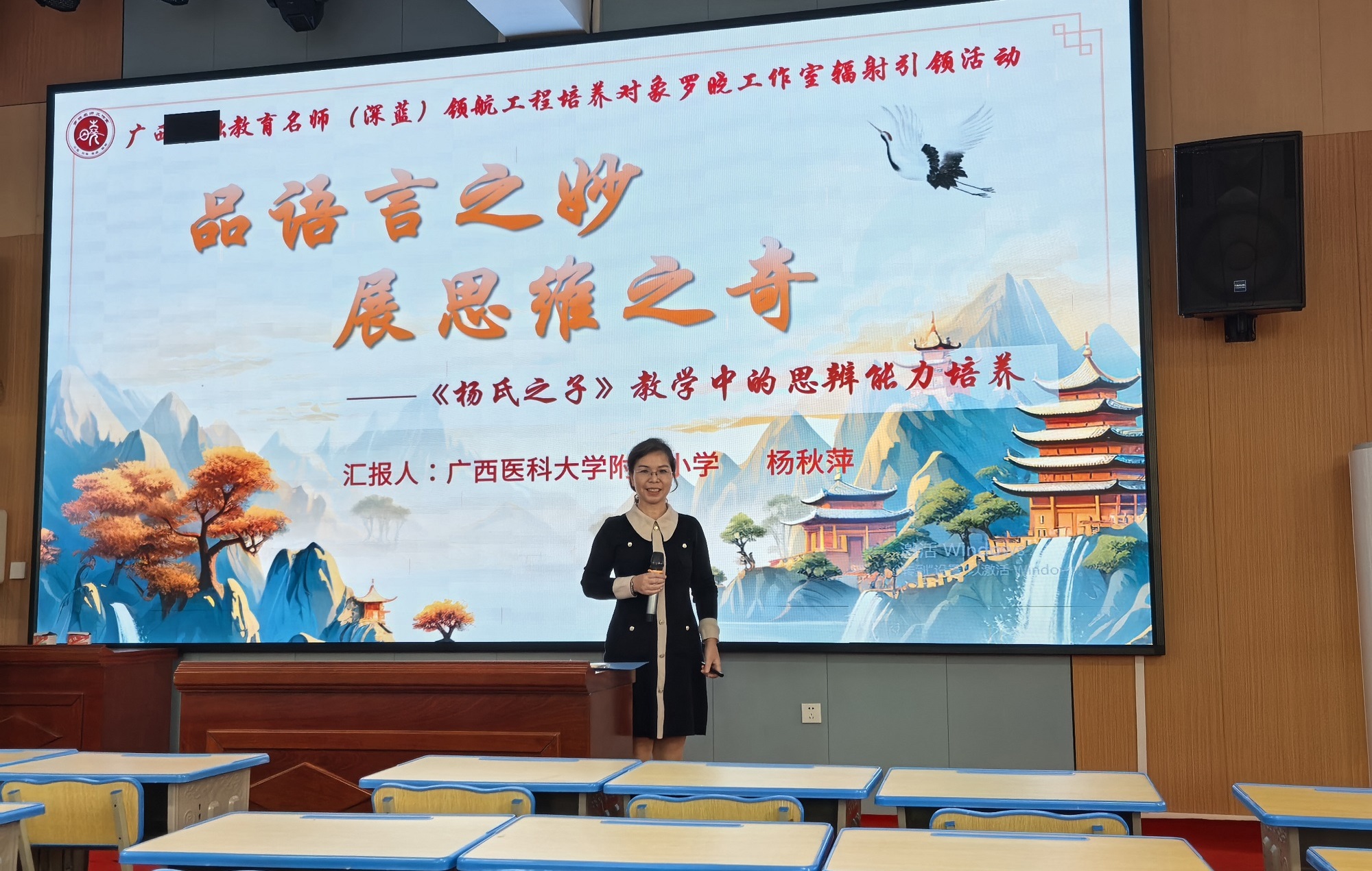 最后,附属小学杨秋萍老师结合《杨氏之子》的课例,作了题为《品语言之妙 展思维之奇——<杨氏之子>教学中的思辨能力培养》的专题讲座。杨老师紧扣2022年版《语文课程标准》“思辨性阅读与表达”任务群,结合学段特点找准教学切入点,明确语言品析与思维培养的核心目标,区分不同任务群下的教学定位。通过构建“单元导入——三阶朗读——咬文嚼字——细读品味”的清晰教学路径。通过溯源“聪”“慧”字理、品析“未闻”之妙、设计迁移应答等环节,将语言品析与思维训练紧密融合,引导学生在文言学习中发展逻辑与批判性思维。杨老师倡导以训诂方法解读文本,以任务驱动激活课堂,并自然勾连《世说新语》整本书阅读,为在文言文教学中落实核心素养提供了扎实可操作的范本。讲座理论与实践相结合,为在场语文教师提供了培养学生高阶思维能力的清晰路径和有效方法。