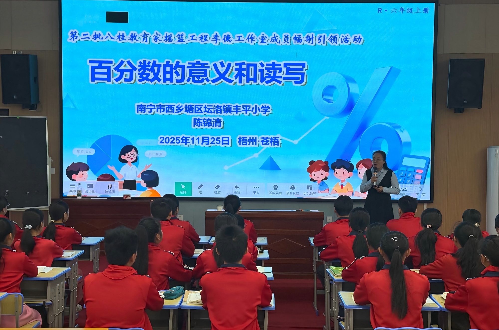11月25日,活动进入数学学科领域,旨在助力数学教师把握核心概念,提升课堂实效。第二批八桂教育家摇篮工程李德工作室成员、南宁市西乡塘坛洛镇丰平小学陈锦清老师,带来了六年级数学示范课《百分数的意义和读写》。