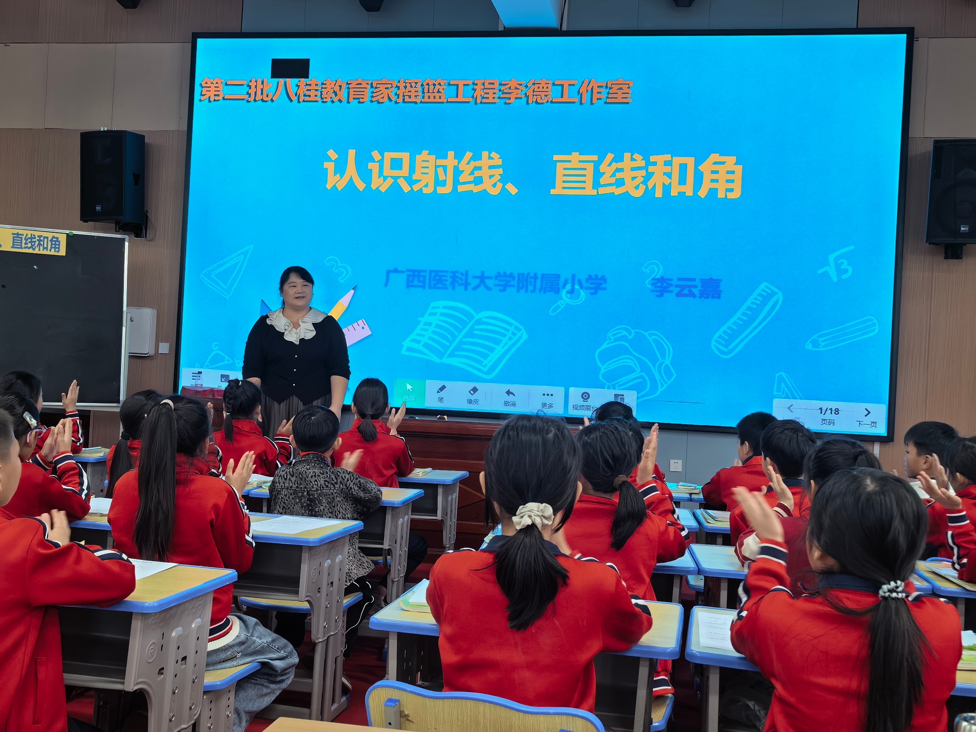接着,第二批八桂教育家摇篮工程李德工作室成员、附属小学李云嘉主任执教一节生动有趣的《认识射线、直线和角》。课堂伊始,李老师借“小熊找宝箱”情境导入,引导学生回忆线段“直的、有两个端点、可度量”的特征,自然衔接新知。教学中,通过测距仪演示、城市射灯图片展示,将射线“无限延伸”的抽象属性具象化;结合“线段一端延长得射线、两端延长得直线”的动态想象与对比,帮助学生明确三者在形态、端点、长度上的联系与区别。在角的教学环节,教师现场动态画图,让学生直观理解“角是从一点引出两条射线组成的图形”,突破教学难点。整堂课融入观察、操作、探究等活动,兼顾趣味性与知识性,既培养学生空间观念,也践行了“AI+生命教育”的教学理念。