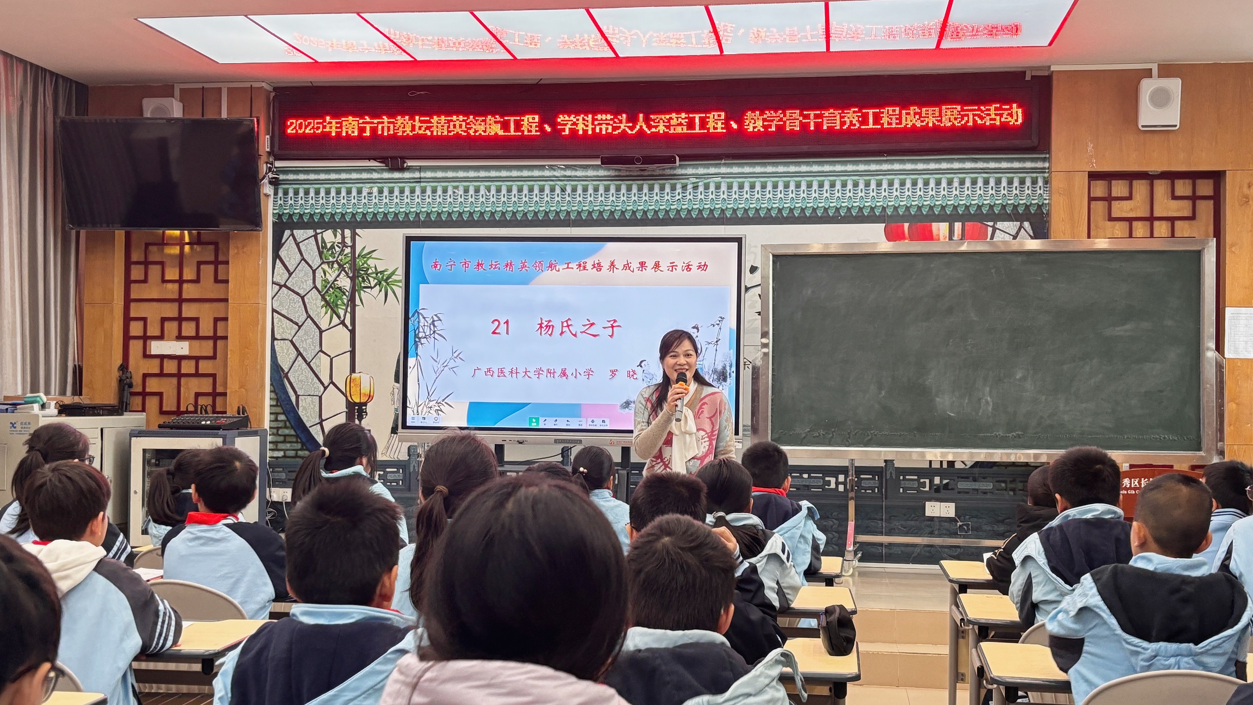 我校附属小学罗晓主任作为南宁市教坛精英领航工程培养对象,在成果展示活动中巧妙运用训诂学方法,带来了一节极具文化厚度与思维深度的文言文示范课——《杨氏之子》,引导学生跨越古今隔阂,深入理解文言精髓。