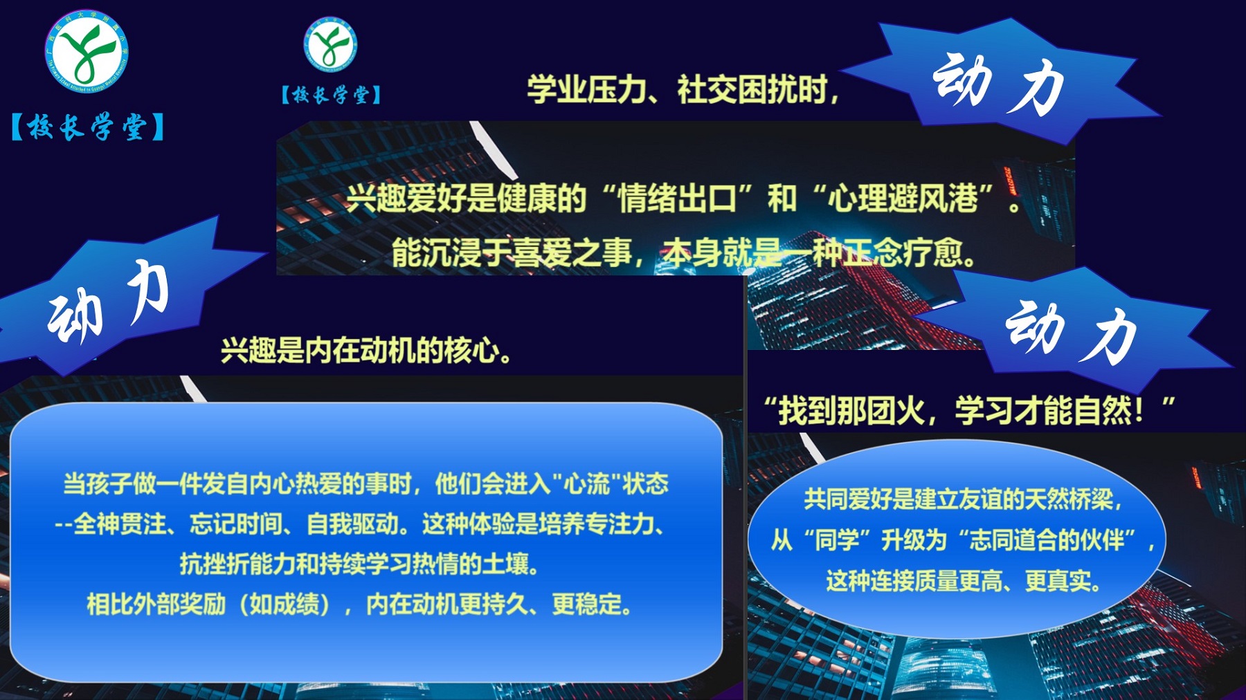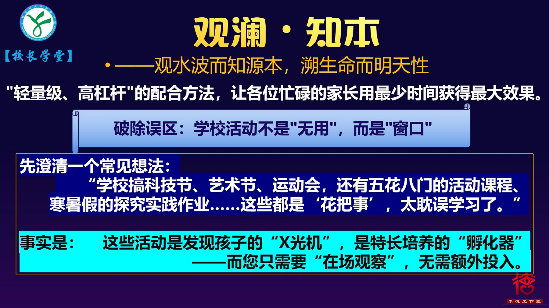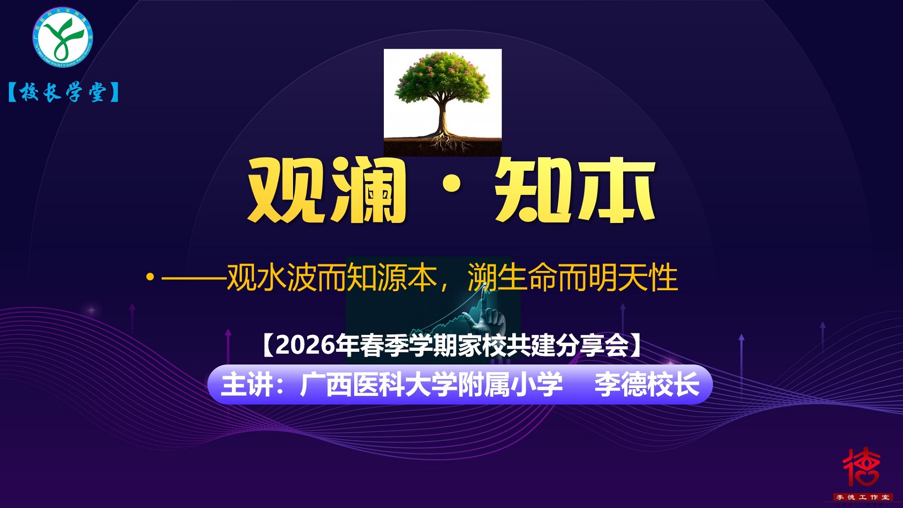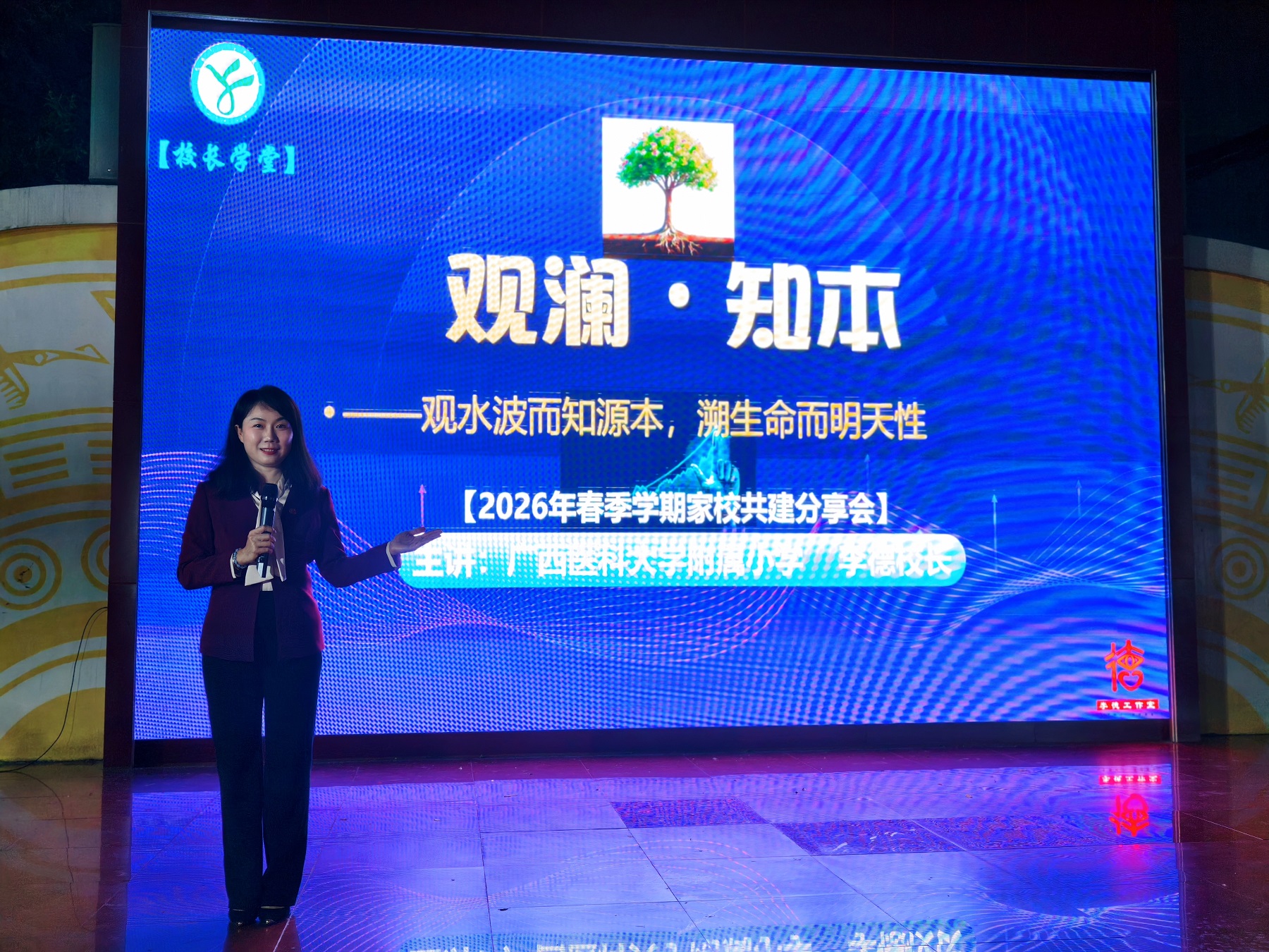 分享会由附小黄琦副校长主持。会议首个环节为“校长学堂”。附小李德校长以“观澜 知本”为题,以“观水波而知源本,溯生命而明天性”为指引,结合寒假科技探索实验成果,让家长明确“找到那团火,学习才能自然”的观点,推动孩子们“在做中学、在学中创”。她希望家长将孩子的兴趣爱好作为人格健全的“必修课”,让孩子在沉浸式体验中感知生命健康的时代意义,点燃内在学习动力,在科创实践与热爱中找到自主空间,培养专注力与抗挫力,筑牢面对未来不确定性的底气。