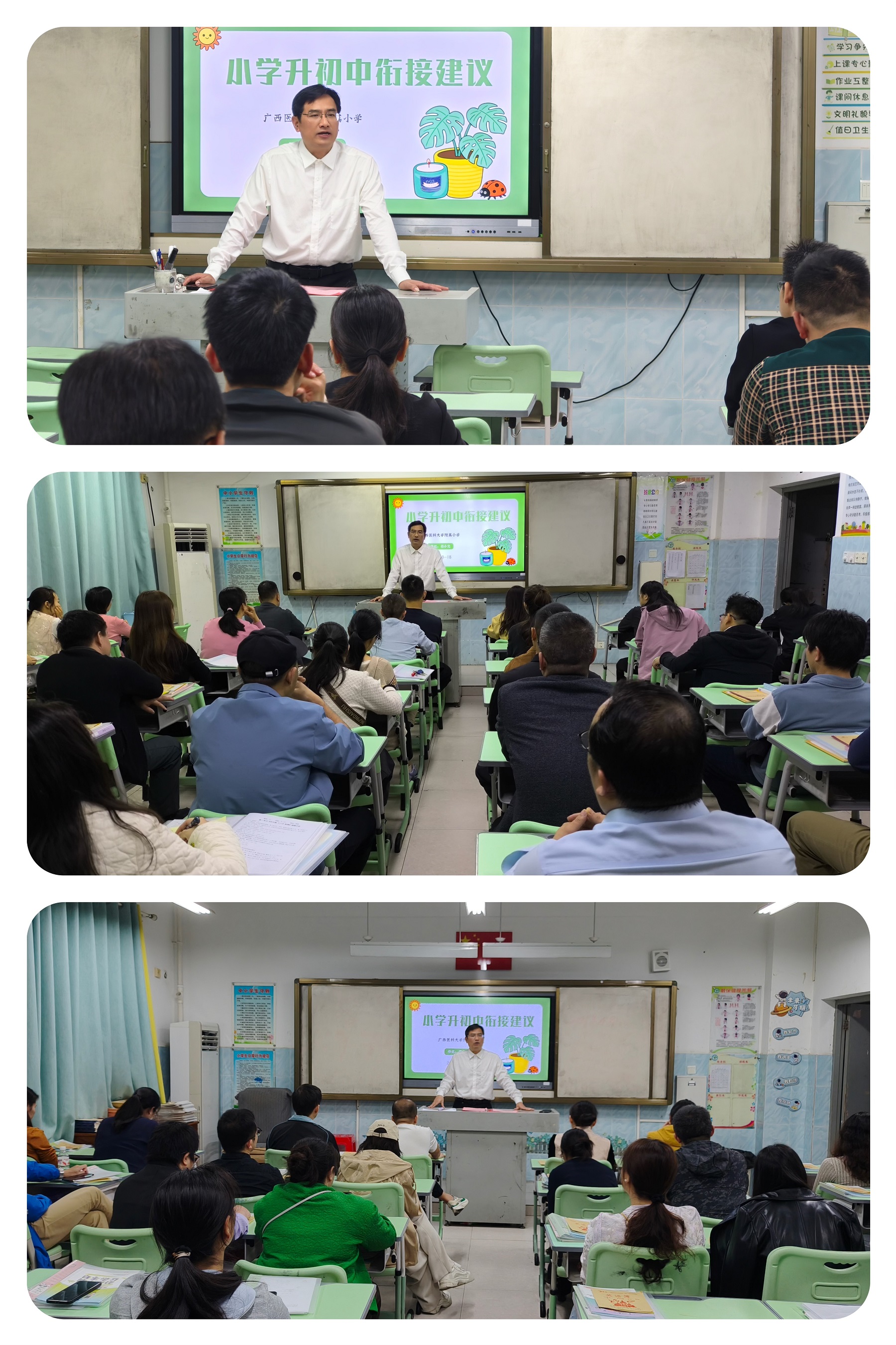 六年级的孩子们即将毕业,迈向人生新起点。为帮助家长平稳应对“小升初”过渡,附小梁小文书记走进六年级教室,与家长们近距离交流升学相关话题。梁书记详细介绍了南宁市区部分初中的基本信息,对比分析了小学与初中在学习方式、评价标准上的不同,建议家长们在过渡阶段重点关注孩子自主学习能力的培养、文化素养的积淀,以及社交适应与心理调适能力的养成,助力孩子从容衔接新阶段。