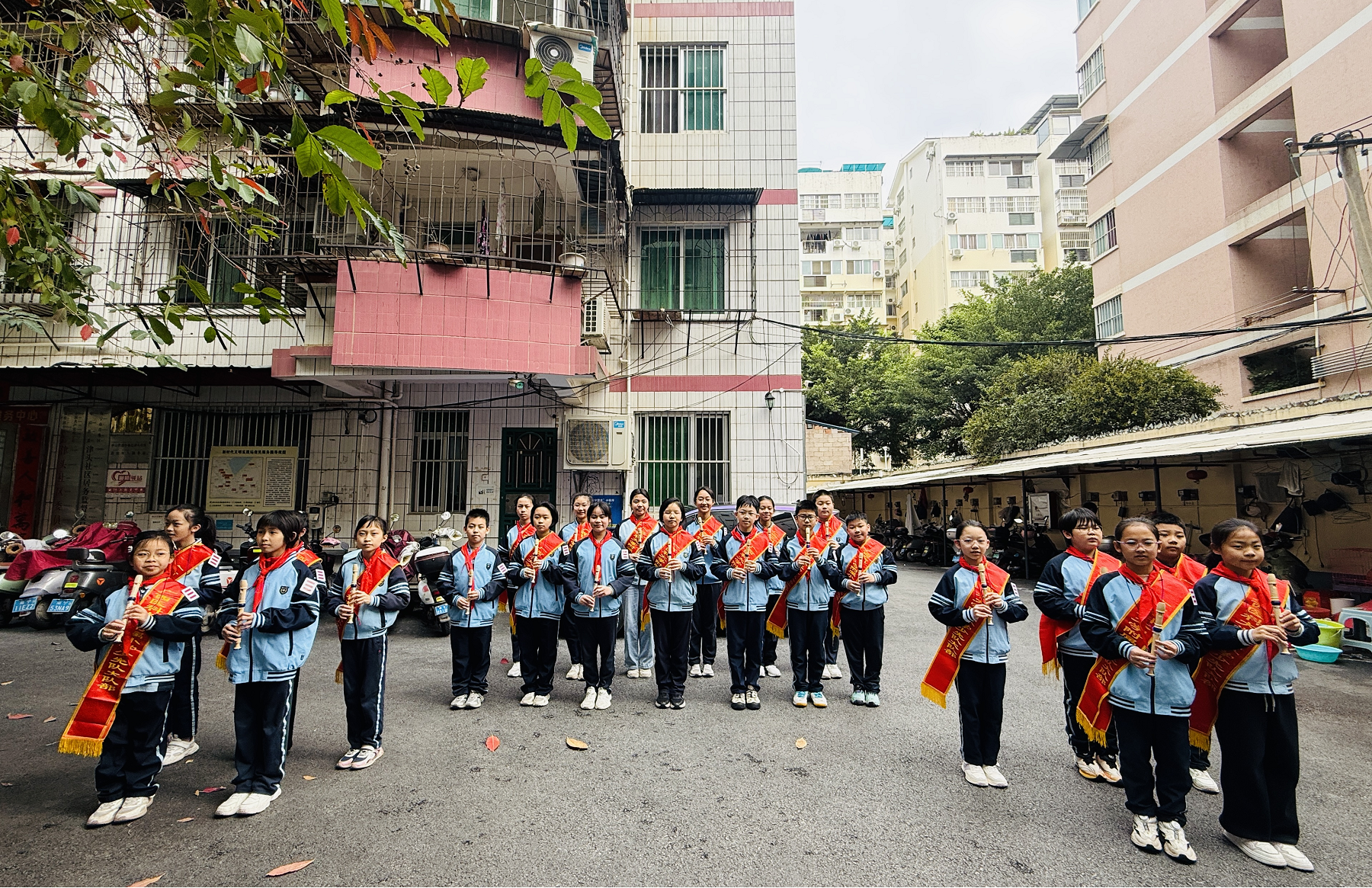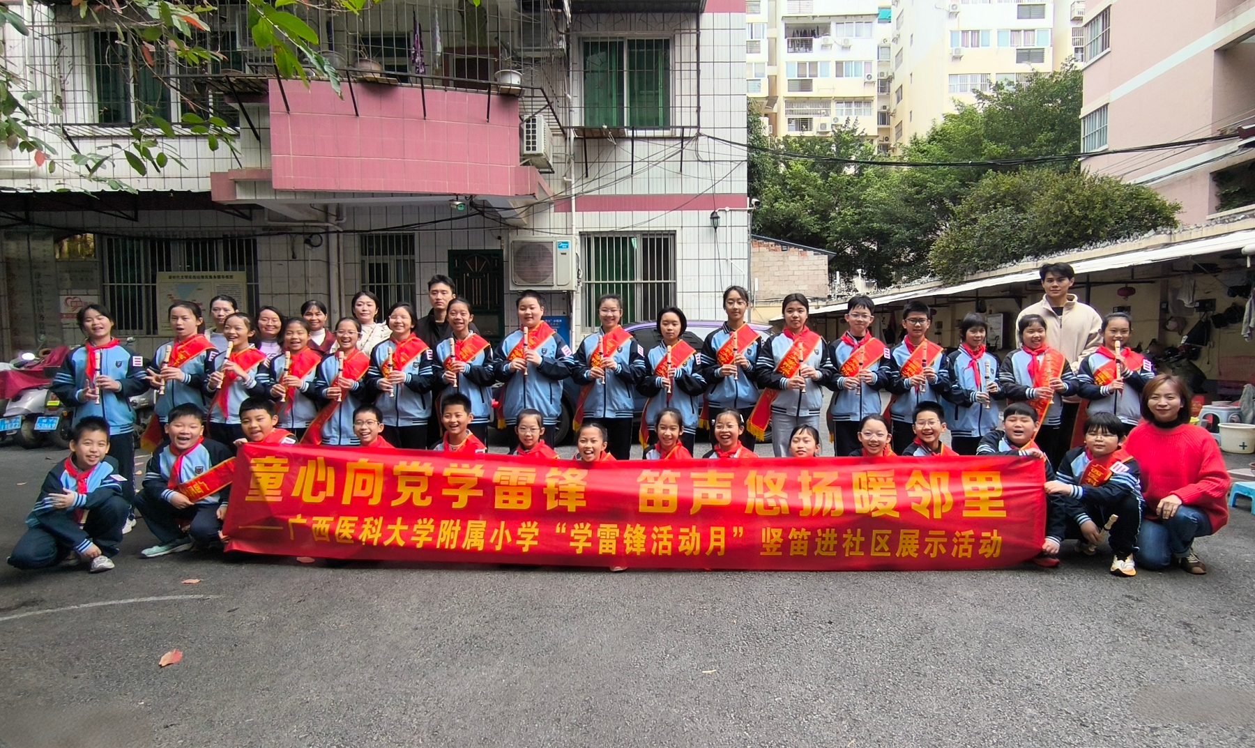 三月春风暖人心,雷锋精神代代传。为深入贯彻落实《义务教育艺术课程标准(2022年版)》精神,推进学校美育工作进社区、进基层。3月10日,我校附属小学少先队大队干与南宁市“十四五”科学规划课题《一核•四链•三评:新课标视域下运用竖笛培养学生艺术表现的实践探究》部分课题组成员,一起走进南宁市青秀区津头社区,开展以“童心向党学雷锋 笛声悠扬暖邻里”为主题的竖笛进社区展示活动,用悠扬笛声传递雷锋精神,让美育之花绽放在邻里之间。