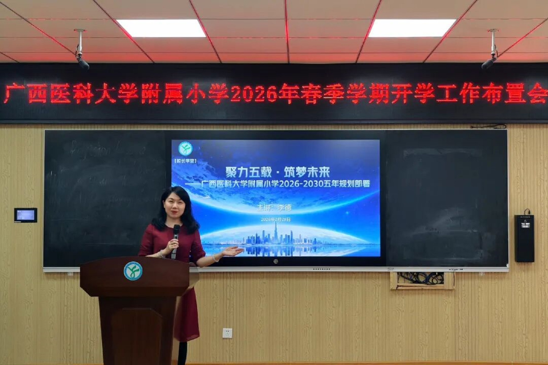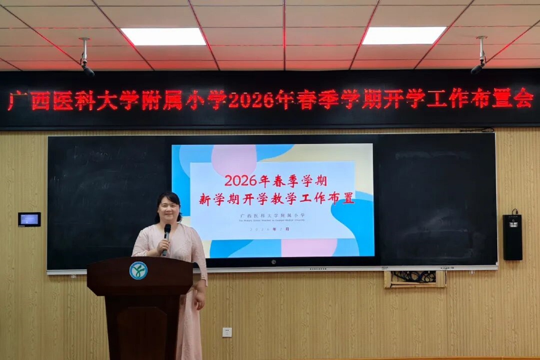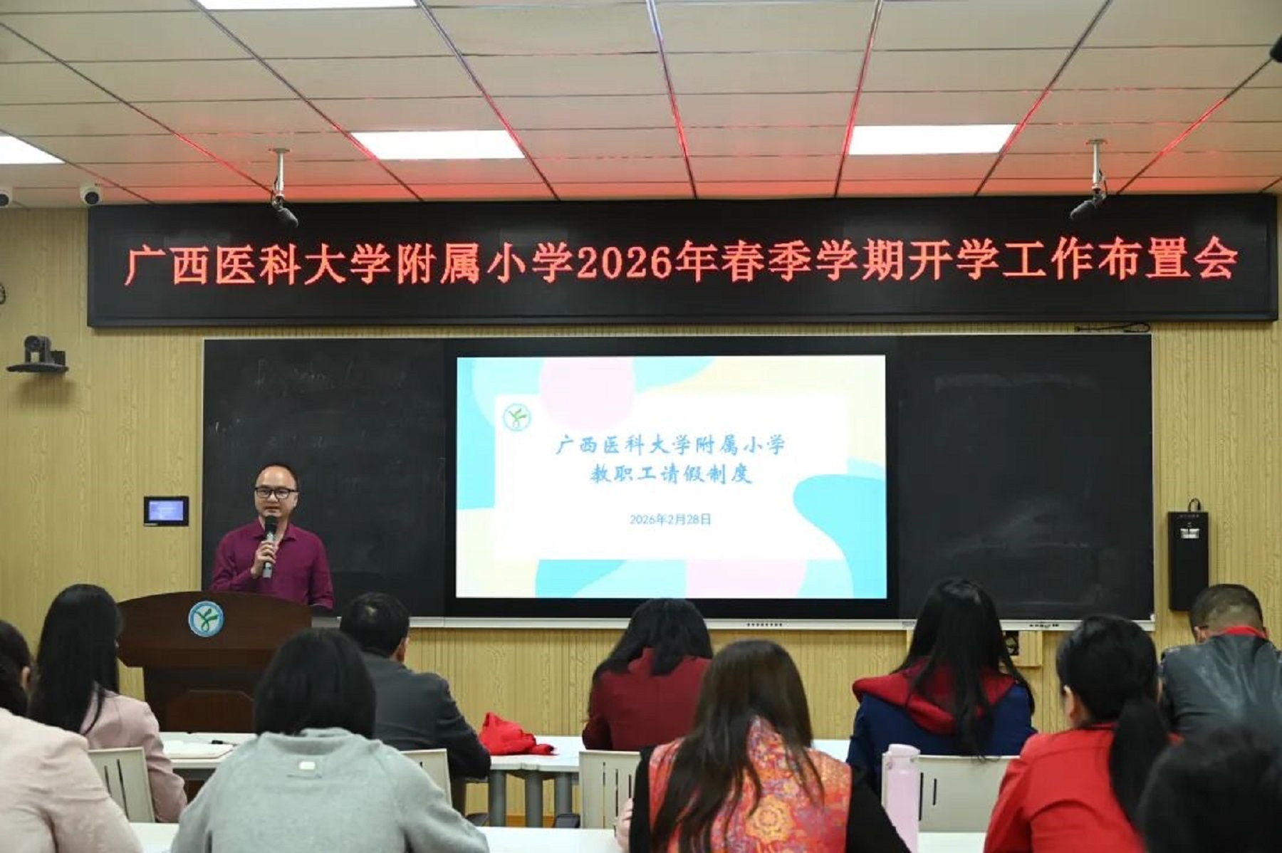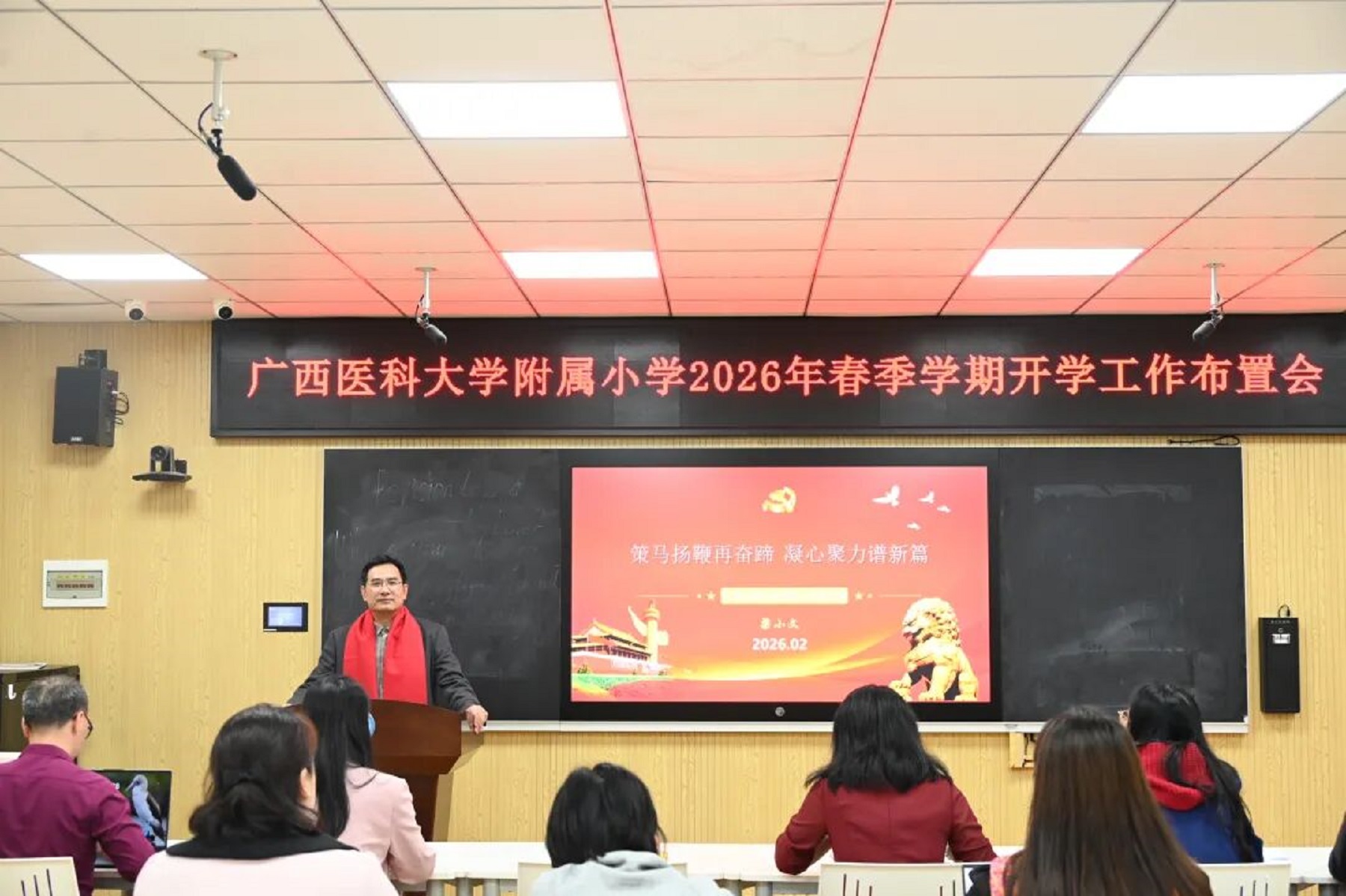 会上,附小梁小文书记以“策马扬鞭再奋蹄 凝心聚力谱新篇 ”为题开启了新学期的教师培训。他总结过去一年来附小全面学习贯彻党的二十大和二十届历次全会精神,扎实开展政治理论学习和师德师风教育,充分发挥党支部的党建引领作用,为学校取得了斐然的教育教学成绩提供了坚强的政治保障。梁书记要求,全体教职员工要紧跟时代步伐,认真学习领会2026年全国和广西壮族自治区教育工作会议精神:扎实推进大中小学思政课一体化改革创新;强化社会实践课程建设,研究探索AI赋能教育教学的有效模式;铸牢中华民族共同体意识,推进健康学校建设,促进学生身心健康、全面发展。在广西医科大学党委和广西医科大学工会附小幼儿园党委的领导下,加大教育教学改革力度,发扬“求真务实,迎难而上”的工作作风,适应教育发展的新形势,激活学校发展内生动力,提高学校治理能力,为把附小建成家门口的优质学校而努力奋斗!