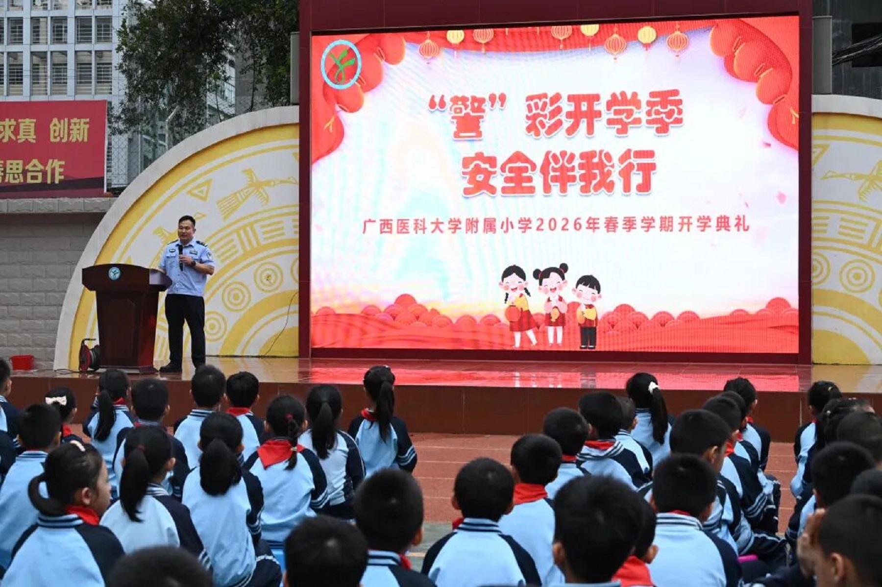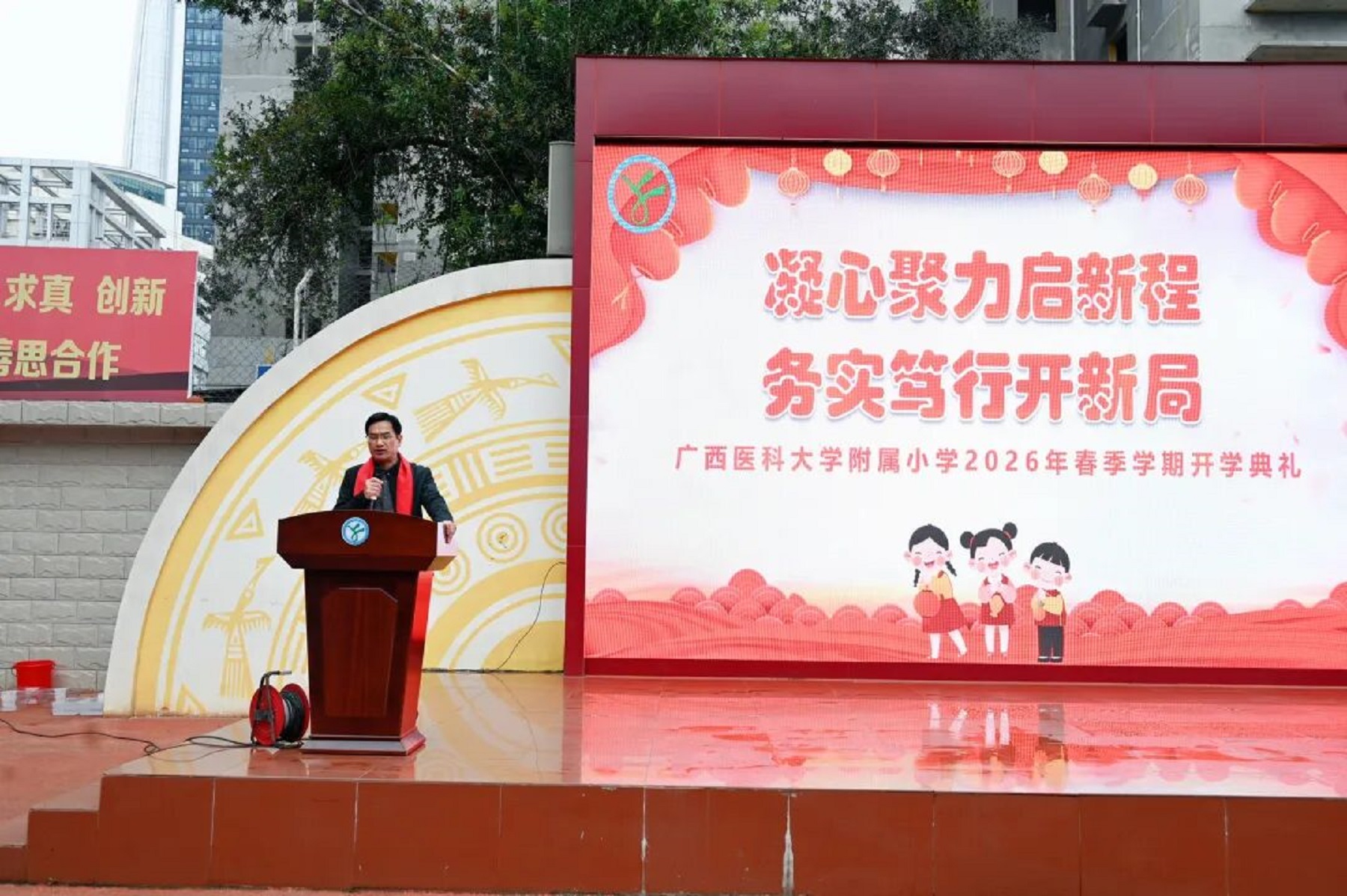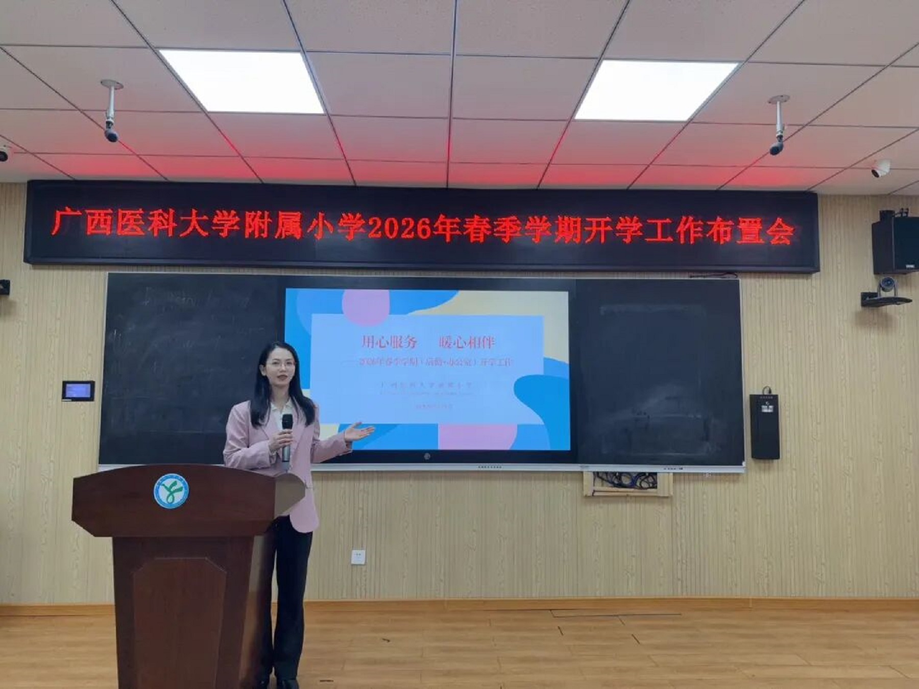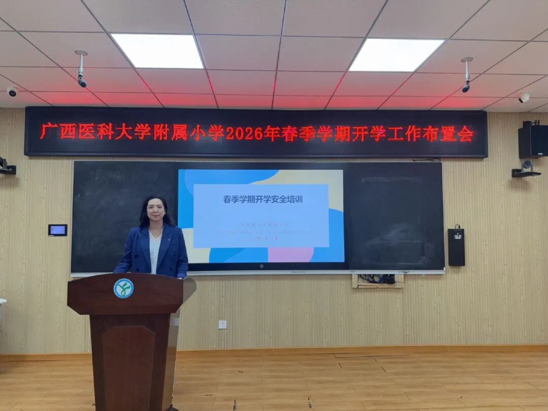 会上,附小梁小文书记以“策马扬鞭再奋蹄 凝心聚力谱新篇 ”为题开启了新学期的教师培训。他总结过去一年来附小全面学习贯彻党的二十大和二十届历次全会精神,扎实开展政治理论学习和师德师风教育,充分发挥党支部的党建引领作用,为学校取得了斐然的教育教学成绩提供了坚强的政治保障。梁书记要求,全体教职员工要紧跟时代步伐,认真学习领会2026年全国和广西壮族自治区教育工作会议精神:扎实推进大中小学思政课一体化改革创新;强化社会实践课程建设,研究探索AI赋能教育教学的有效模式;铸牢中华民族共同体意识,推进健康学校建设,促进学生身心健康、全面发展。在广西医科大学党委和广西医科大学工会附小幼儿园党委的领导下,加大教育教学改革力度,发扬“求真务实,迎难而上”的工作作风,适应教育发展的新形势,激活学校发展内生动力,提高学校治理能力,为把附小建成家门口的优质学校而努力奋斗!