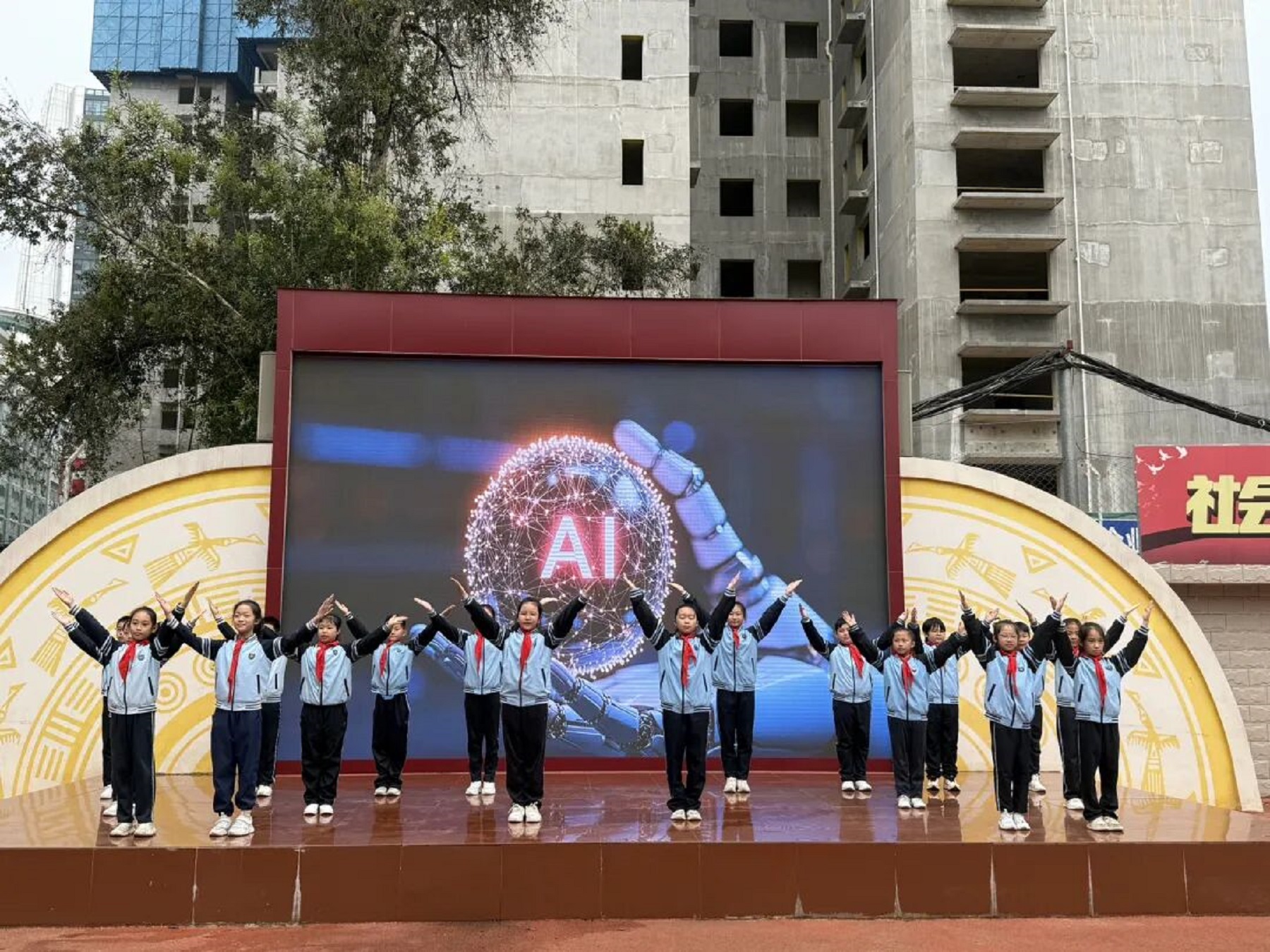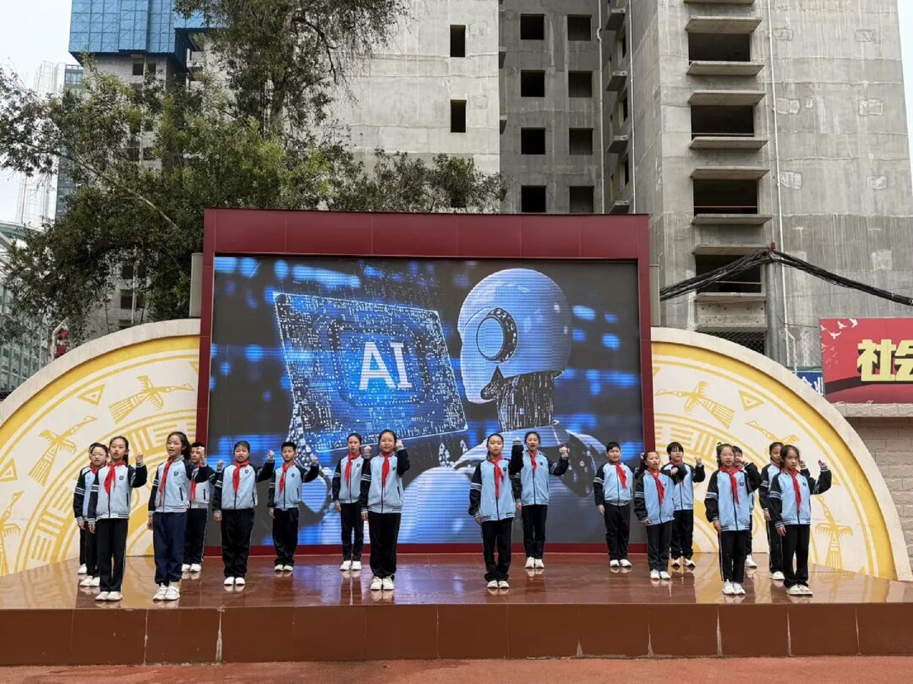 典礼进入最热闹的环节,学校大队干们带来了精心准备的综合表演。队员们精神饱满,朗诵铿锵有力,既展现了AI助力教育的美好前景,传承了广西医科大学“敬佑生命、救死扶伤”的优良传统,也向全体同学发出了“健康成长、逐梦强国”的倡议,呼吁大家坚持运动、努力学习、热爱生活、勇于创新。队员们朝气蓬勃的姿态、真挚的情感,展现了附小少年有梦想、敢拼搏、勇向前的精神面貌,赢得了师生们的阵阵欢呼和掌声。