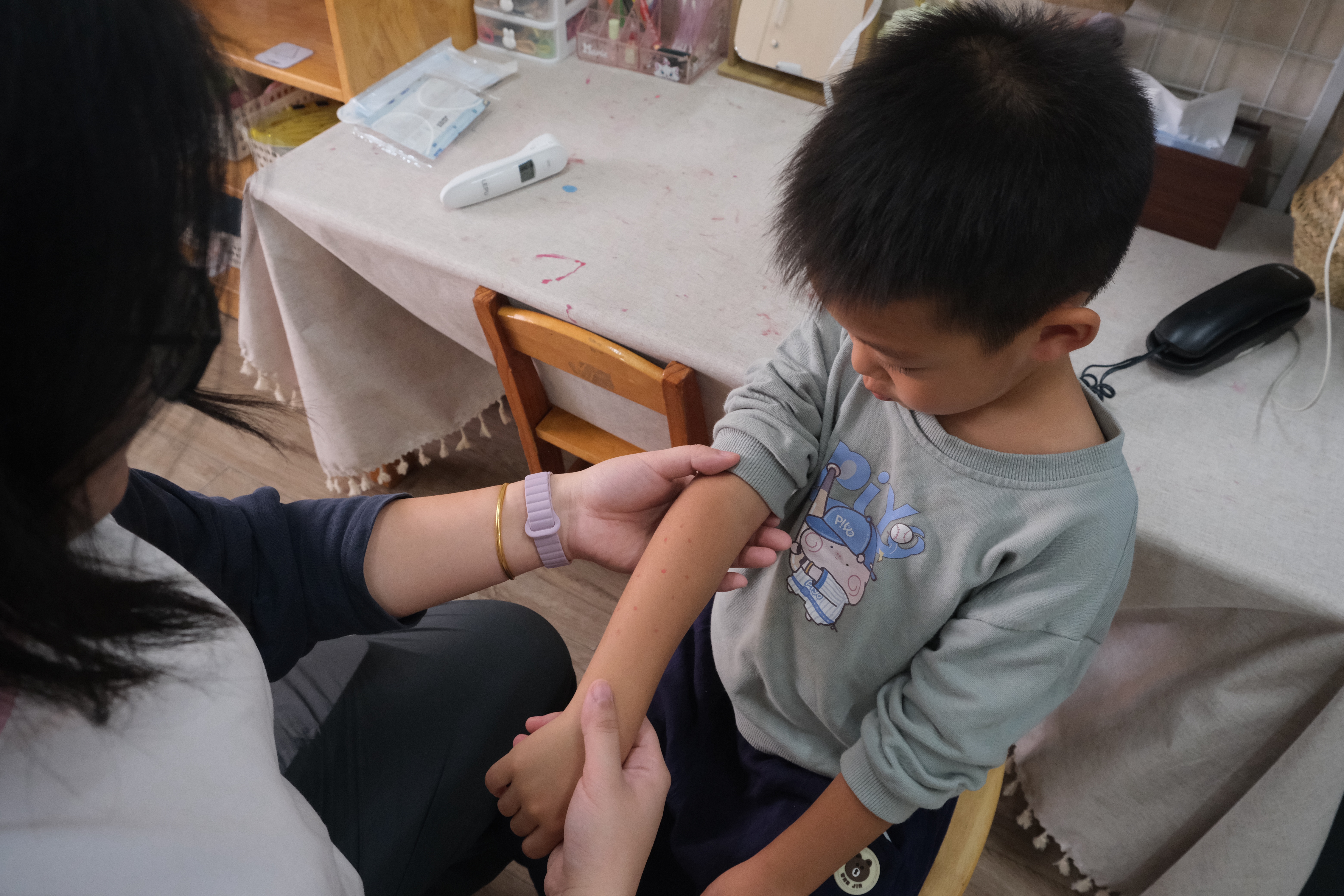 中四班在集体活动期间,班级老师发现一名幼儿精神萎靡,经测量体温达38.5℃,并观察到其手臂、腿部有蚊虫叮咬引起的红疹。