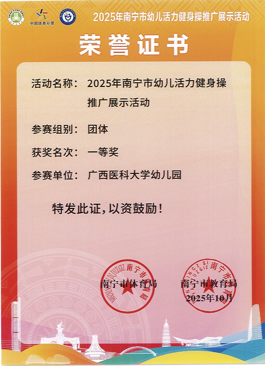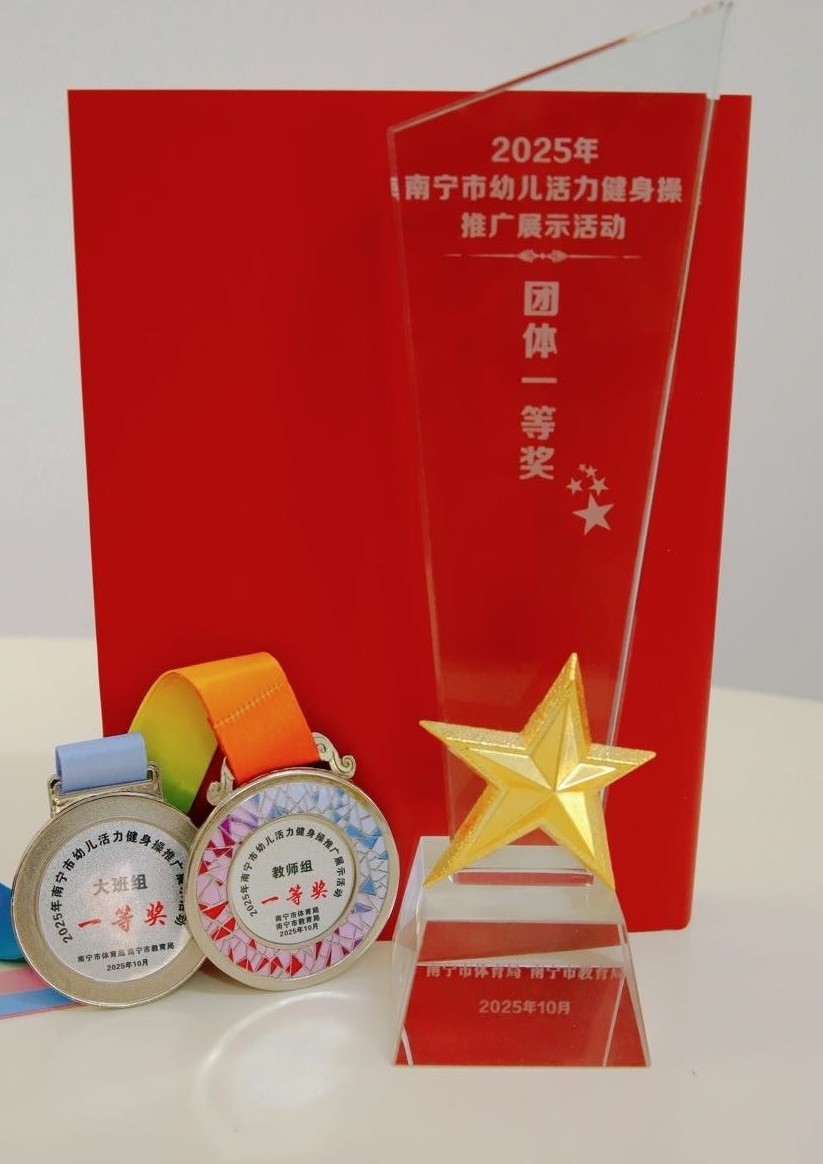 在近日举办的 “奔跑吧·少年”2025年南宁市幼儿活力健身操推广展示活动中,我校幼儿园师幼团结协作、表现出色,荣获三项一等奖的优异成绩!