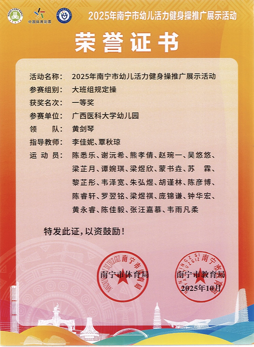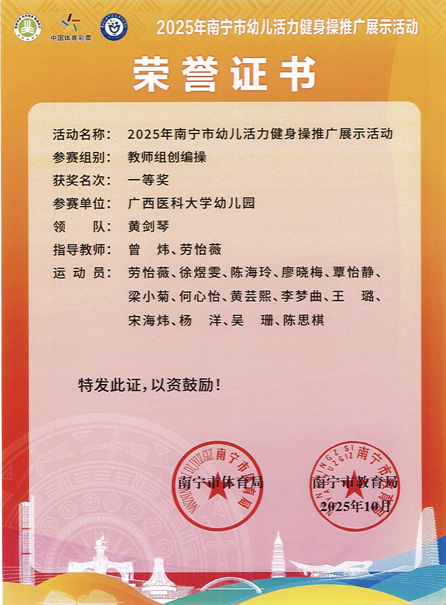 他们的表现赢得了现场评委与观众的认可,最终在全市23支优秀队伍中脱颖而出,荣获三项一等奖,展现了广西医科大学幼儿园的良好风貌。