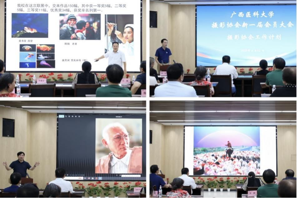 新一届协会会长蔡瑜生作协会工作计划,并分享了他的“摄影之路”,以亲身经历激励会员们用热爱照亮创作之路。邝海、林军分别展示了各自的摄影作品,为与会者带来了一场视觉与思想的盛宴。龙盛京还特别介绍了校工会举办的2025年教职工书画摄影展的入选作品,展现了医大教职工镜头下的“劳动之美”“八桂风貌”“幸福家园”。