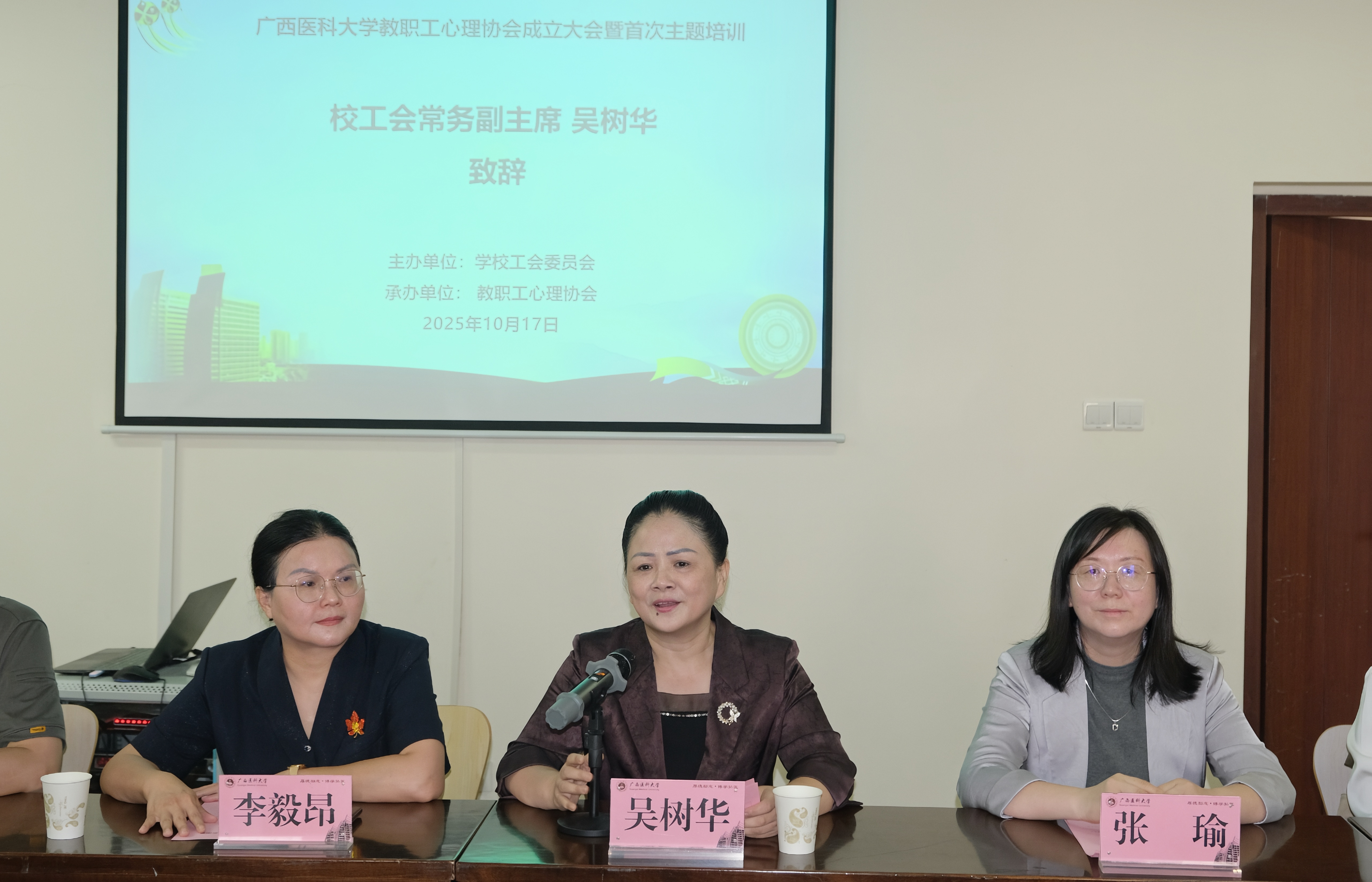 吴树华在致辞中表示,心理协会的成立回应了教职工对心理关怀的迫切需求,是推进“幸福校园”建设的重要举措;工会作为教职工的“娘家人”,将在场地、经费、资源等方面提供支持,助力构建全覆盖、可持续的心理支持体系。