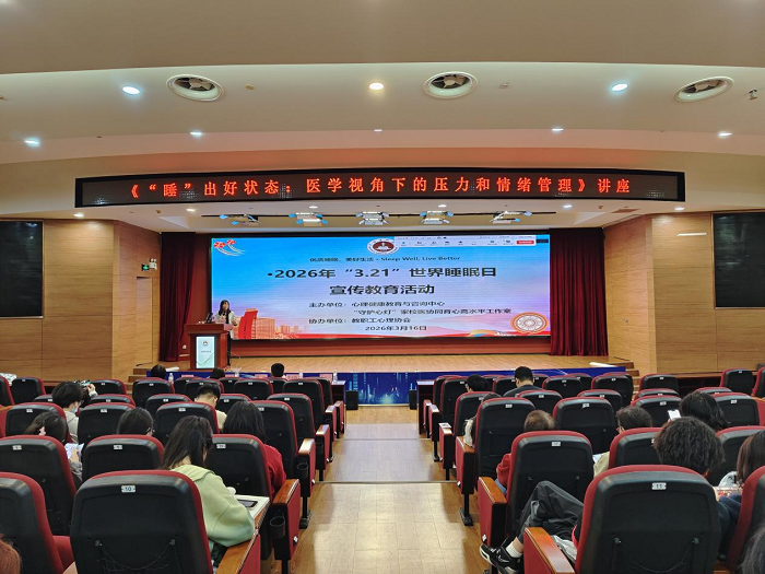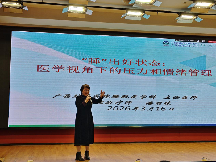 为积极响应“健康第一”教育理念,落实教育部2026新春第一会的会议精神,以专业力量守护师生睡眠健康,助力学生全面发展,近日,由心理健康教育与咨询中心、“守护心灯”家校医协同育心高水平工作室主办,教职工心理协会协办的《“睡”出好状态:医学视角下的压力和情绪管理专题讲座》在校本部科技楼报告厅举行。讲座特邀2019年“第一届广西优秀医师奖”获得者、广西脑科医院睡眠医学科主任医师、心理治疗师潘丽妹主讲,心理健康教育与咨询中心副主任张瑜主持,全校近300名师生参与。
