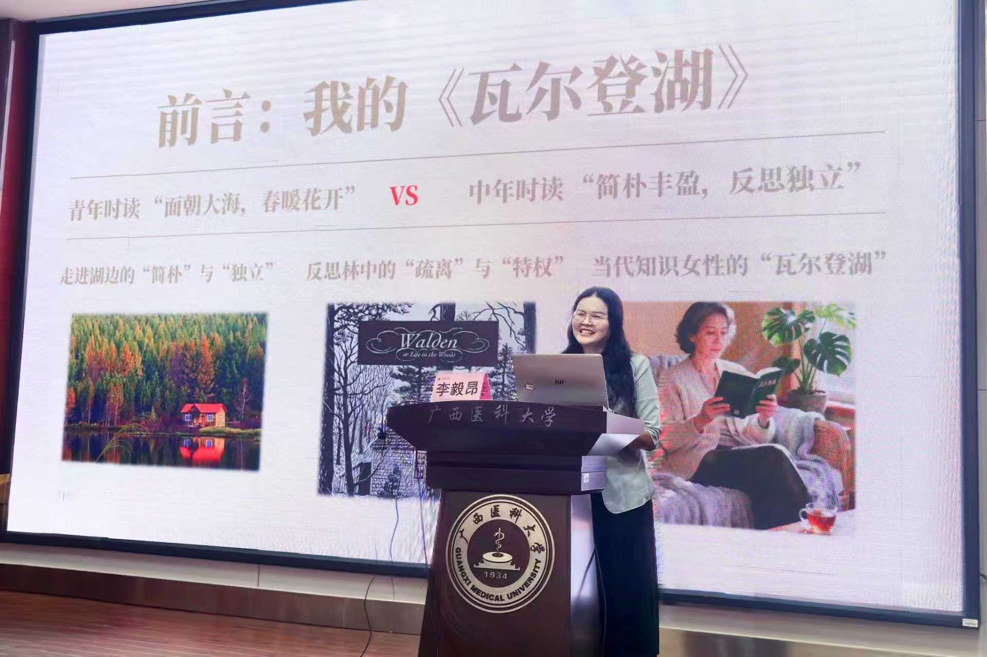 在首期读书会分享环节,教职工文体协会理事长李毅昂以“中年知识女性视角下《瓦尔登湖》的文学价值与当代启示”为题,结合个人成长经历,与在场师生探讨极简生活与育人本真,引发热烈反响。现场听众积极参与互动,气氛融洽。