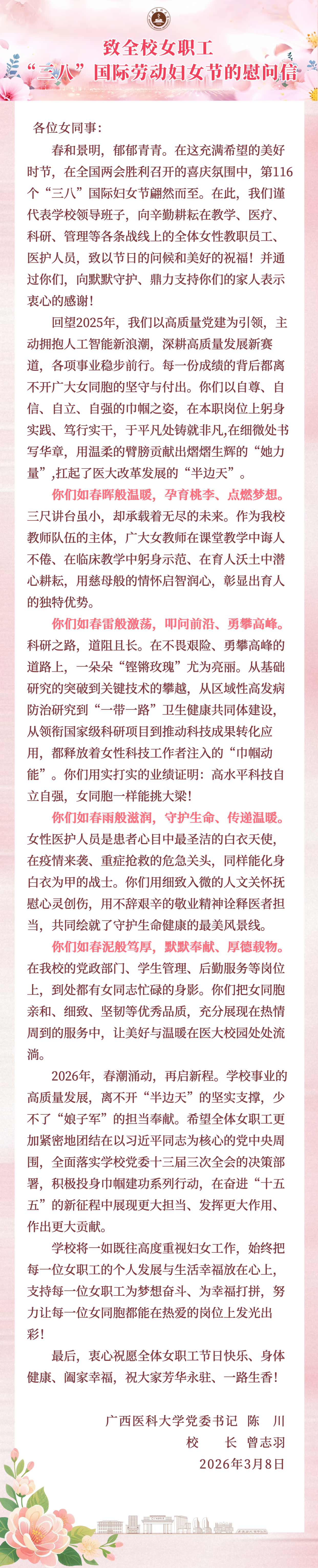 来源:校工会 宣传部 发布时间:2026-03-08 作者:广西医科大学 校对:蒋洪涛 审核:吴树华
