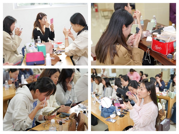 活动现场氛围温馨融洽,女教职工们认真聆听、积极互动、现场实操,沉浸式学习打造专属精致妆容。答疑交流环节,大家围绕日常护肤、妆容持久度、不同场合妆容适配等问题踊跃提问,覃秋桦耐心解答,分享了诸多实用美妆小窍门与护肤心得。